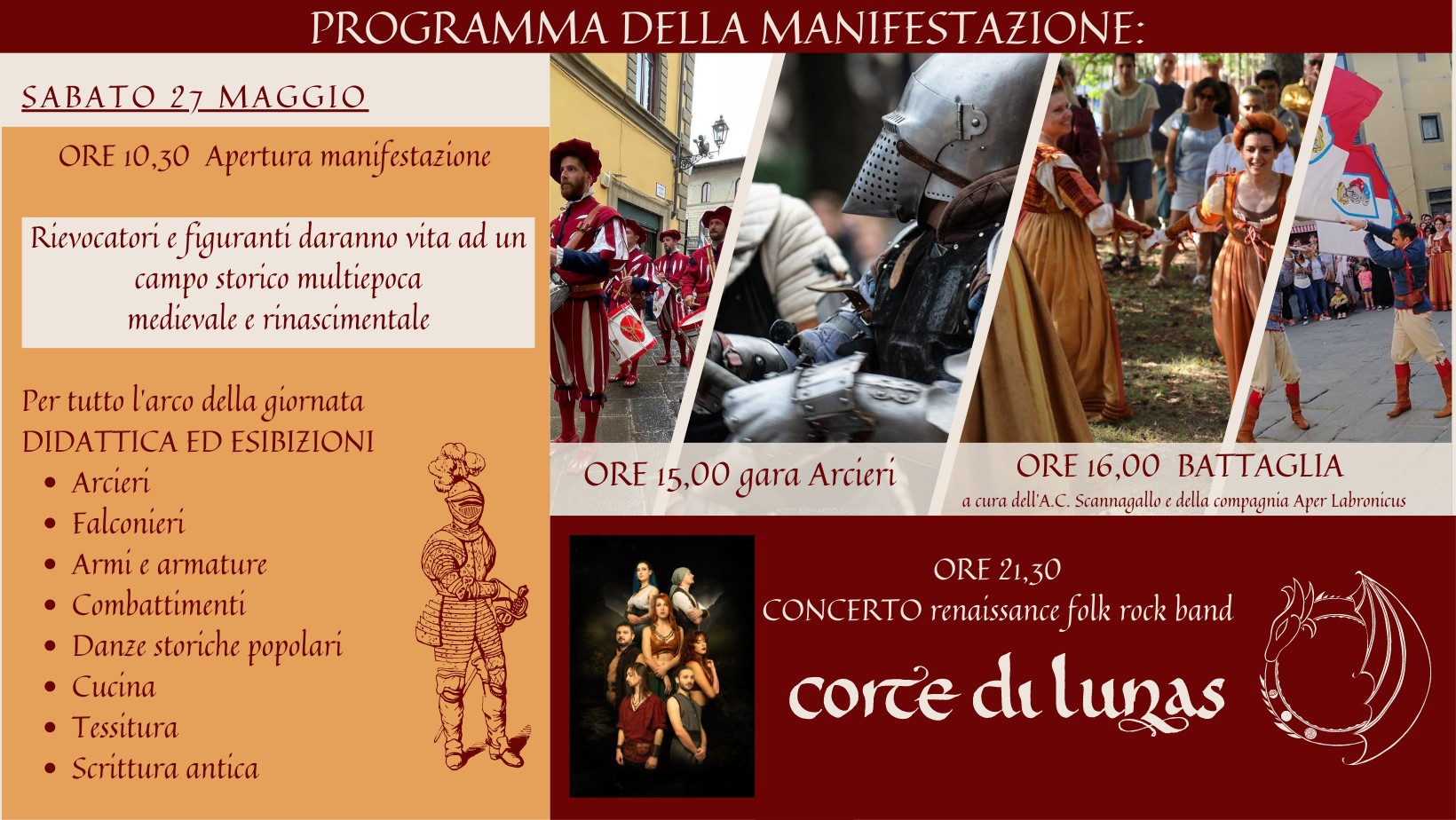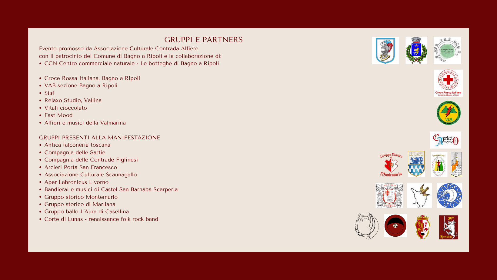 Le associazioni intervenute sono l' A.C. Scannagallo di Arezzo, Aper Labronicus di Livorno, la Compagnia Giovanni dalle Bande Nere di Firenze, la Compagnia delle Sàrtie di Firenze, la Compagnia delle Contrade Figlinesi, con la Brigata Arcieri Porta San Francesco, la Compagnia della Gorga Nera, Arcieri del lago, e la compagnia Araba Fenice di Firenze.